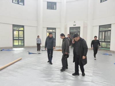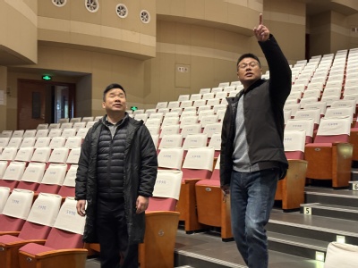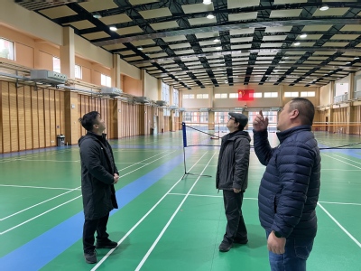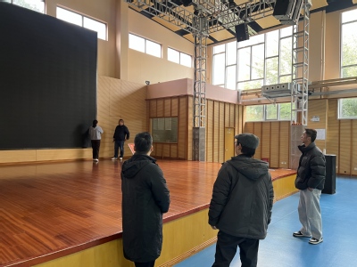 随后,检查组走访大礼堂、体育馆,查看场地及课程使用情况,了解大屏使用率与使用年限,管理员就体育馆顶部 LED 灯具易损特性进行说明。